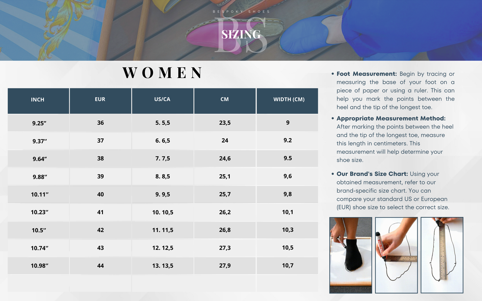 - Our Brand's Size Chart: Using your obtained measurement, refer to our brand-specific size chart. You can compare your standard US or European (EUR) shoe size to select the correct size.