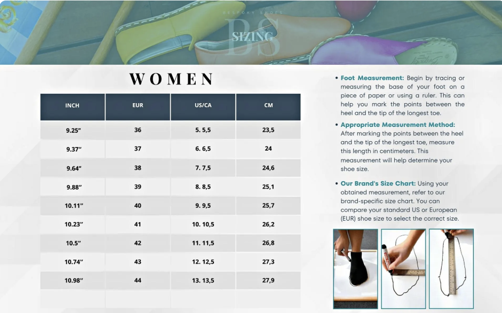 - Our Brand's Size Chart: Using your obtained measurement, refer to our brand-specific size chart. You can compare your standard US or European (EUR) shoe size to select the correct size.