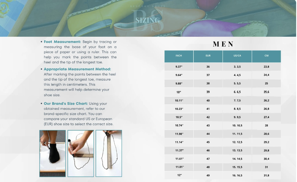 When buying shoes, comfort and fit are essential, which is why knowing the measurements of your foot can be beneficial. With our enhanced return and exchange policy, we offer a 30-day window for free returns or exchanges on new and unused products. At BespokyShoes, your satisfaction is our priority.